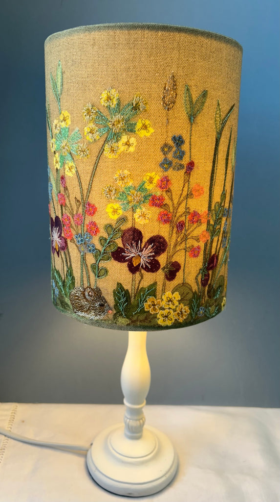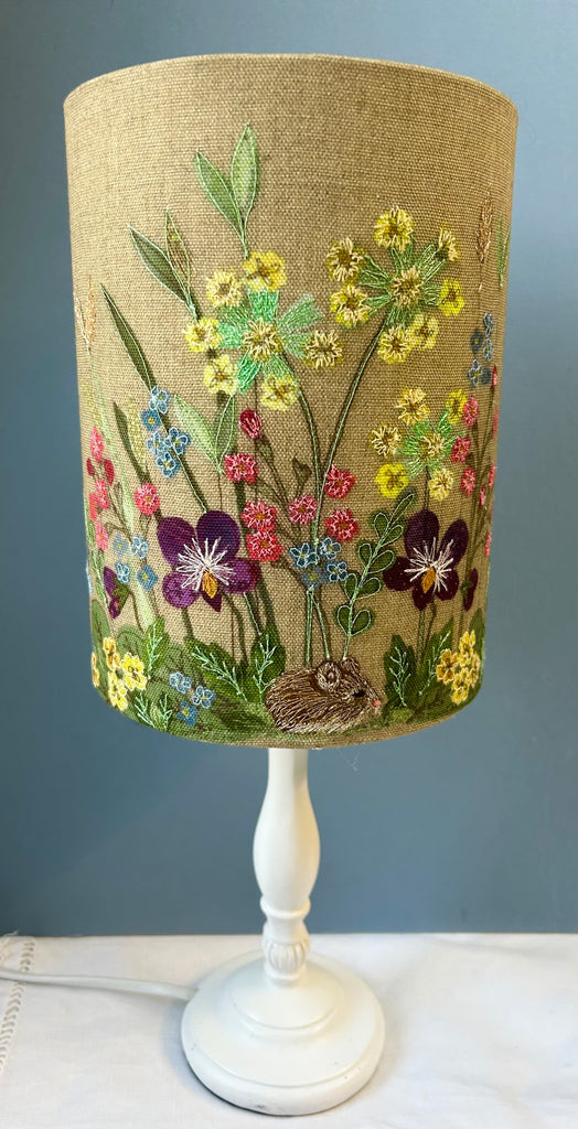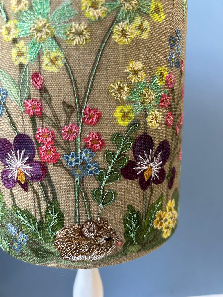 Inspired by The Diary Of An Edwardian Lady by Edith Holden this lampshade is designed with Spring in mind. It features tiny wild pansies, forget-me-nots, cowslip, birds-eye primrose, yellow primroses and a tiny mouse.